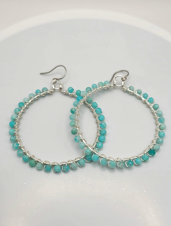 Elevate your everyday look with these Amazonite hoop earrings from Cookie’s Coffer. Featuring calming seafoam blue-green gemstone beads hand-wrapped in sterling silver, these hoops are perfect for those who love natural beauty with a hint of modern style.